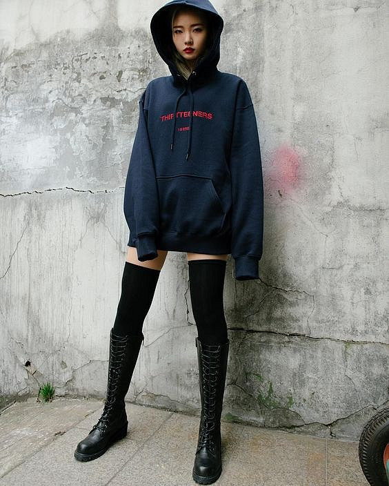 Phong cách giấu quần thực sự rất hot trong giới trẻ. Hãy thử phối áo hoodie dáng dài với quần đùi jeans và một đôi boot cao để hoàn thiện outfit.